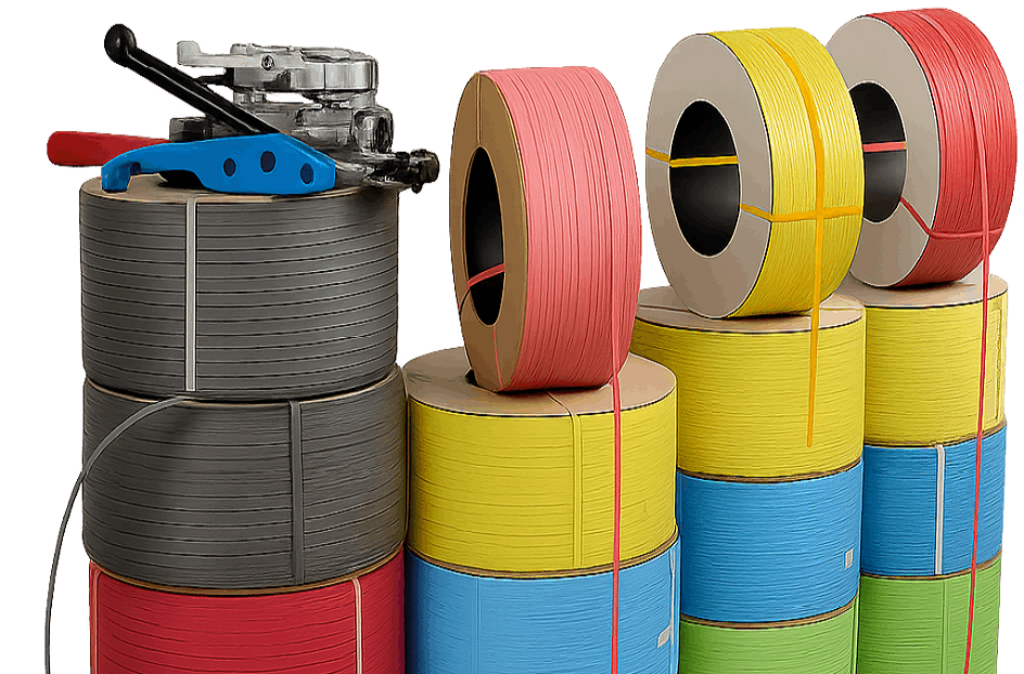 - تسمههای بستهبندی PP و PET: تسمههای PP در سایزهای مختلفی از جمله ۸، ۱۰، ۱۲، ۱۴ و ۱۶ میلیمتر و تسمههای PET در سایزهای ۱۶ و ۱۹ میلیمتر برای استفاده در دستگاههای تسمهکشی تماماتوماتیک، نیمهاتوماتیک و دستی تولید میشوند.